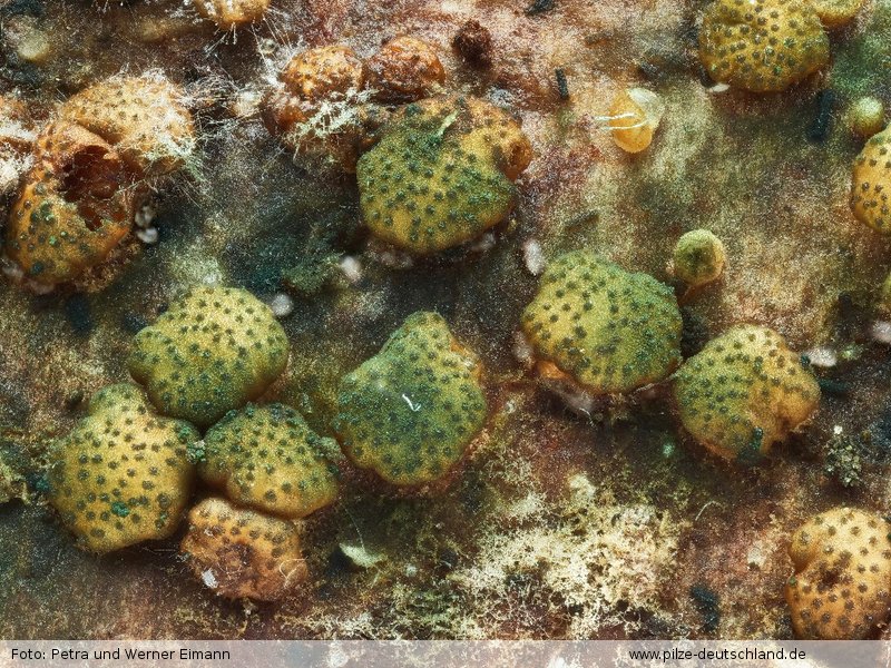 Synonyme: Chromocrea aureoviridis (Plowr. & Cooke) Petch 1938, Hypocrea aureoviridis Plowr. & Cooke 1880
